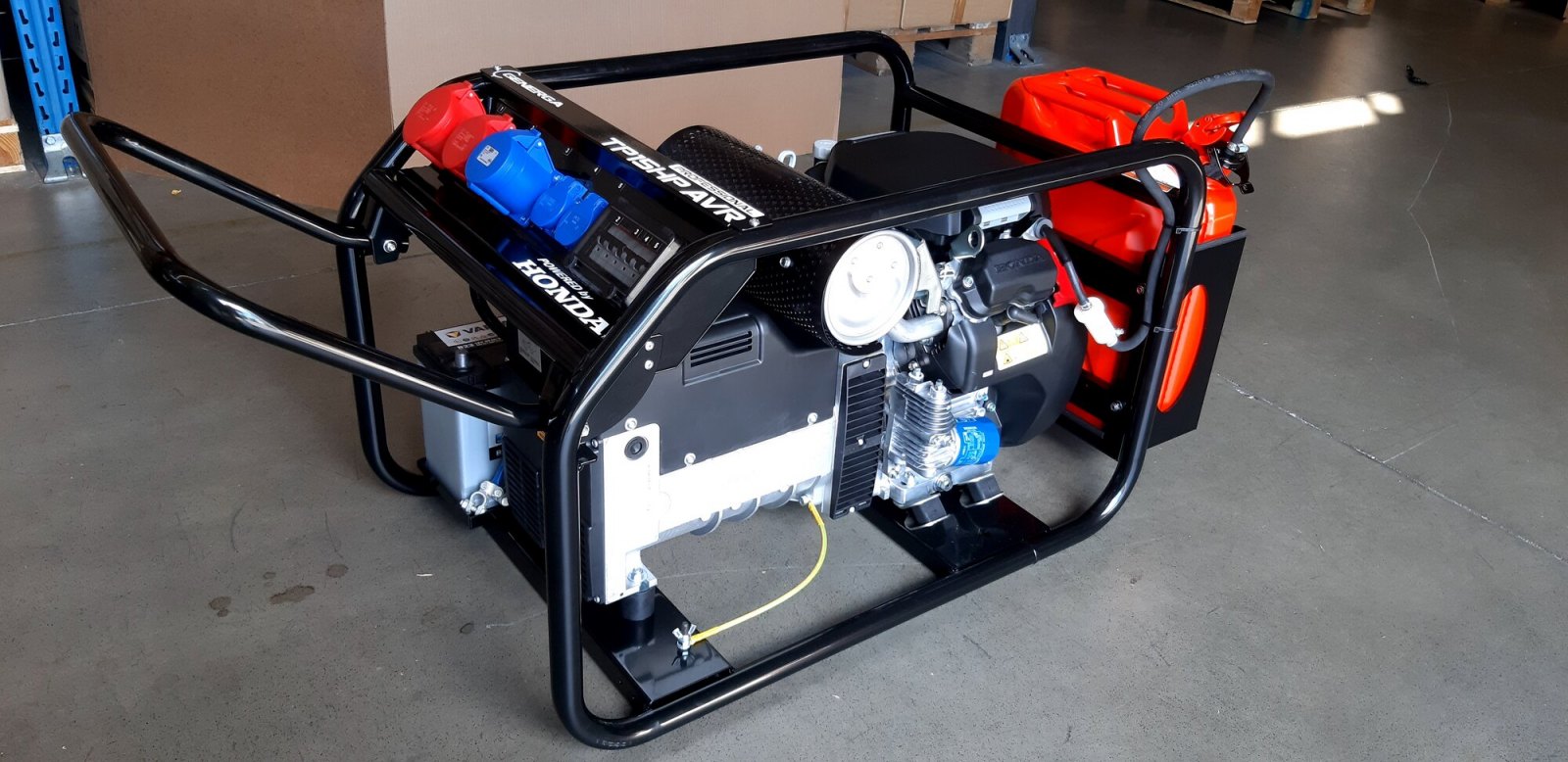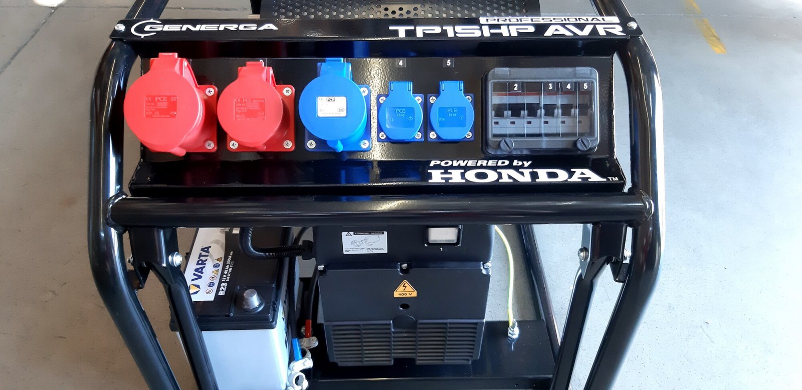 Přepracovaná a vylepšená varianta profesionální rámové elektrocentrály nabízí nový zásuvkový panel s přehledně uspořádanými zásuvkami jak pro odběr 400V/50Hz, tak i pro 230V/50Hz. Panel je navíc opatřen snadno přístupnou a přehlednou pojistnou skříní s jističi pro každou zásuvku. Zásuvkový panel disponuje zásuvkami 1x CEE (32A 400V), 1x CEE (16A 400V), 1x CEE (32A 230V) a 2x CEE (16A 230V). Alternátor je opatřen navíc hlavním vypínačem, umístěným z čela alternátoru hned pod zásuvkovým panelem. Vše přehledné a snadno dosažitelné pro obsluhu.