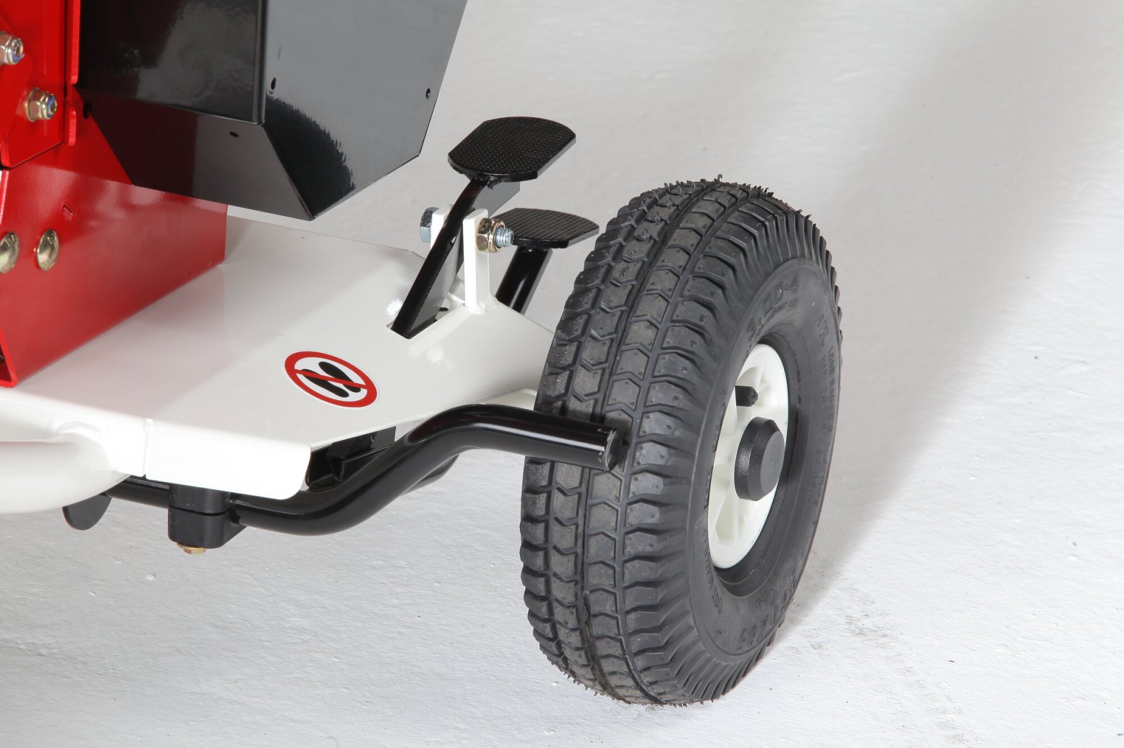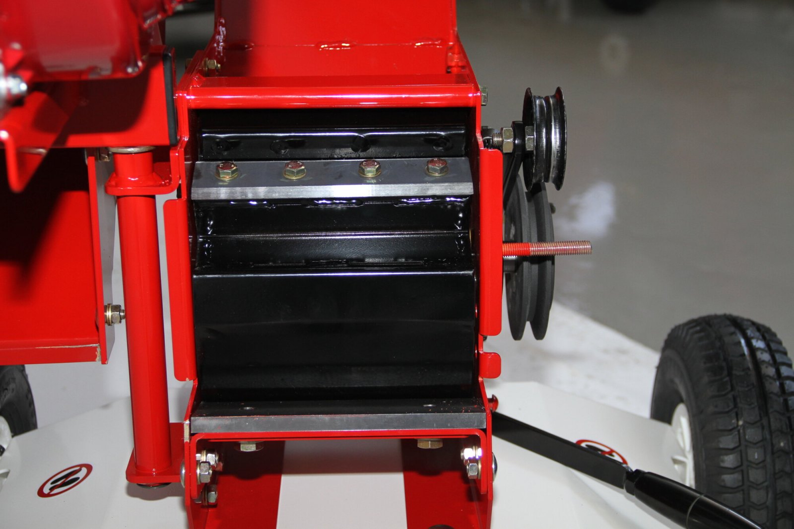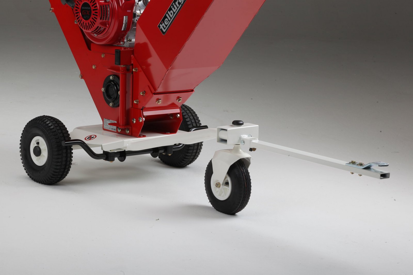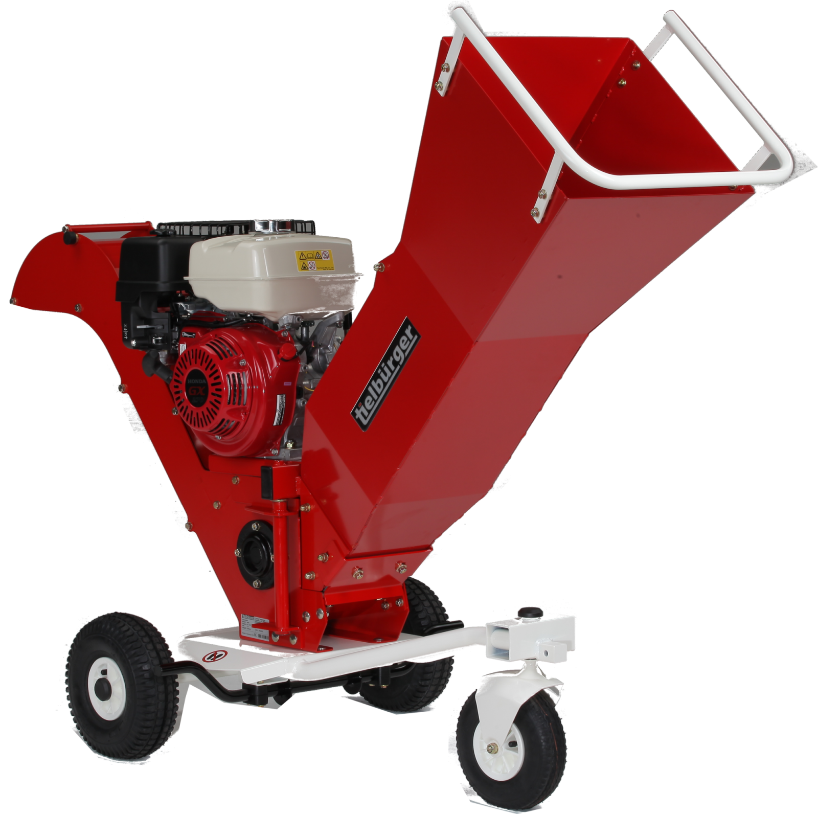 Profesionální model motorového štěpkovače střední výkonové třídy, poháněného výkonným a spolehlivým profesionálním motorem, vlastním manipulačním podvozkem a dvounonožovým válcovým drtičem dřevěného odpadu.